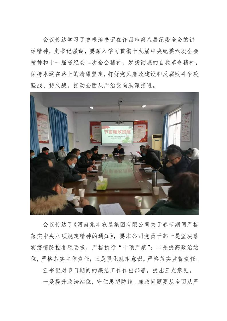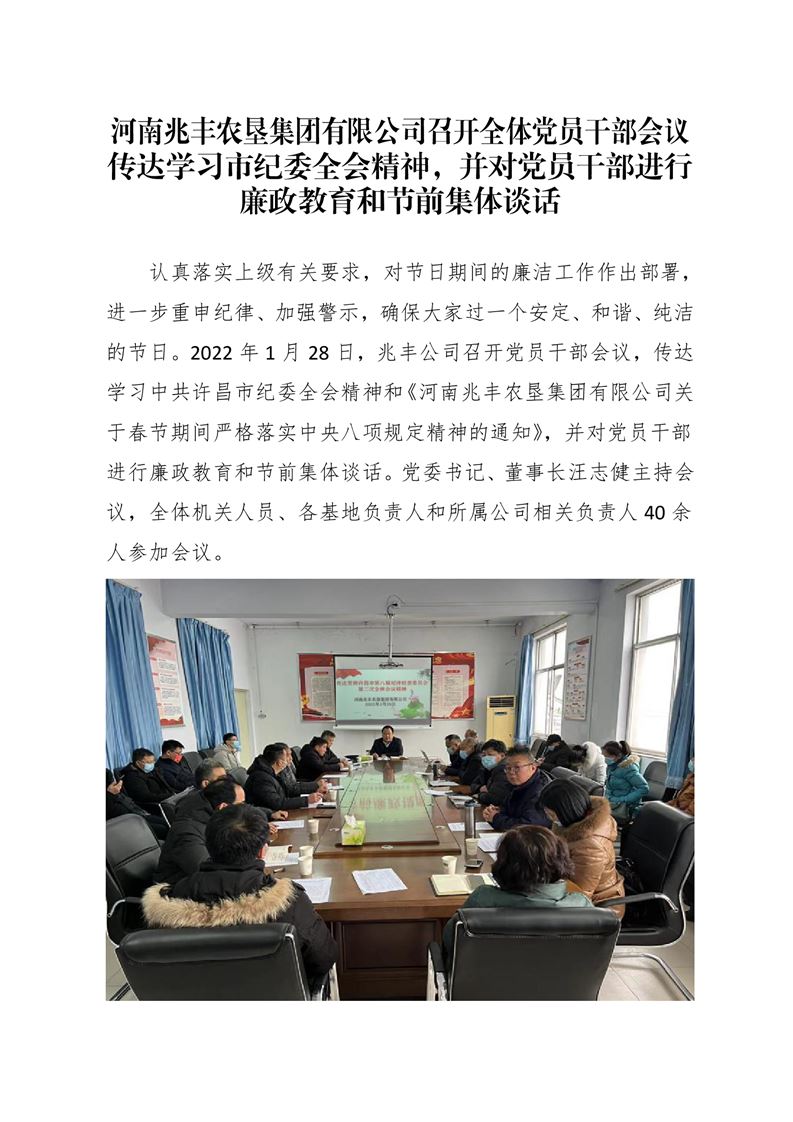 · 河南兆豐農墾集團有限公司 召開全體黨員干部會議傳達學習市紀委全會精神,并對黨員干部進行廉政教育和節前集體談話