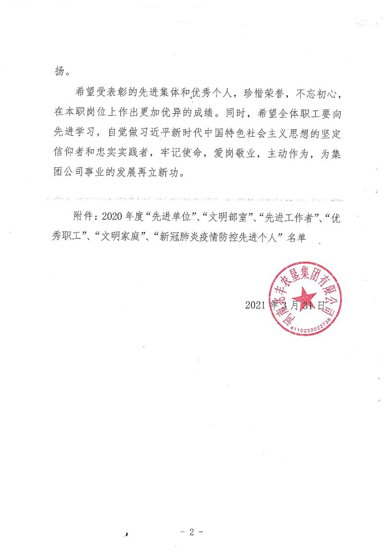 · 河南兆豐農(nóng)墾集團(tuán)有限公司 關(guān)于表彰2020年度“先進(jìn)單位”、文明部室”、“先進(jìn)工作者”、“優(yōu)秀職工”、“文明家庭”、新冠肺炎疫情防控先進(jìn)個(gè)人”的決定